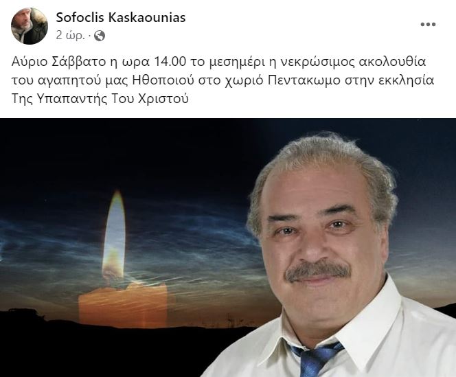 Ο Σοφοκλής Κασκαούνιας μέσα από τον προσωπικό του λογαριασμό στο Instagram μας ενημέρωσε ότι η κηδεία του Δημήτρη Ξύστρα θα πραγματοποιηθεί αύριο Σάββατο 29 Απριλίου στην εκκλησία Της Υπαπαντής Του Χριστού στο χωριό Πεντάκωμο.