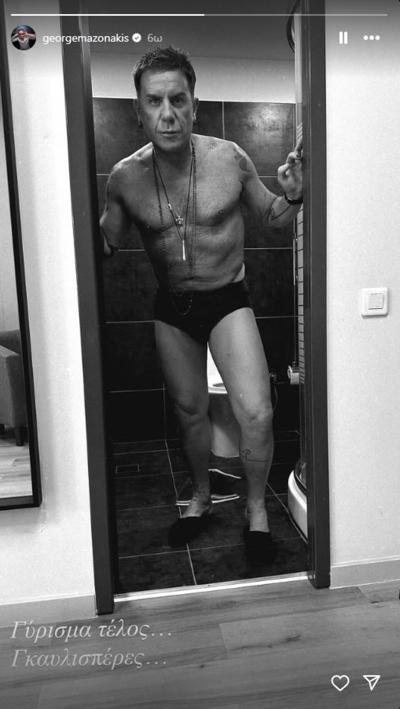 Αυτή τη φορά, ο τραγουδιστής ανέβασε στο Instagram μια ασπρόμαυρη φωτογραφία μέσα από το μπάνιο του, όπου ποζάρει ημίγυμνος, αφήνοντας τους θαυμαστές του να σχολιάσουν την τολμηρή ανάρτηση. Όπως έγραψε στο story του, η φωτογραφία τραβήχτηκε μετά το τέλος ενός γυρίσματος.