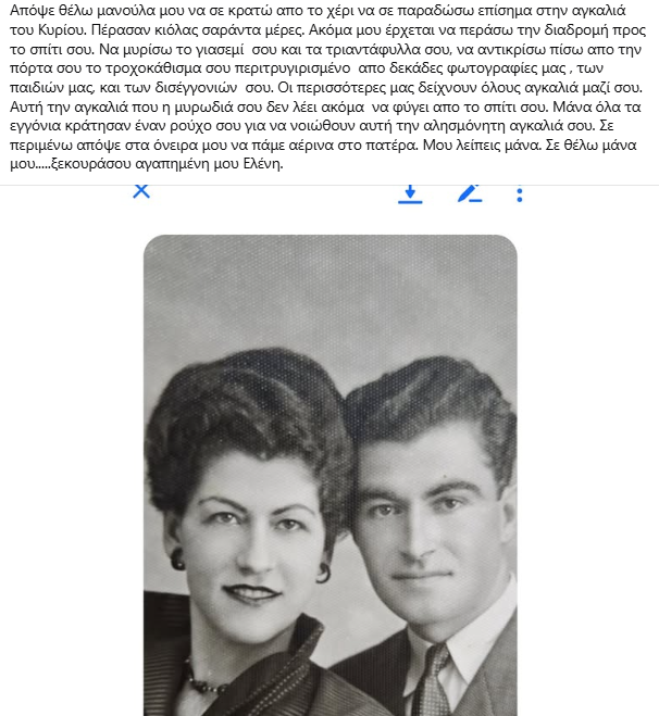 Όπως αναφέρει μεταξύ άλλων, «Οι περισσότερες μας δείχνουν όλους αγκαλιά μαζί σου. Αυτή την αγκαλιά που η μυρωδιά σου δεν λέει ακόμα να φύγει απο το σπίτι σου. Μάνα όλα τα εγγόνια κράτησαν έναν ρούχο σου για να νοιώθουν αυτή την αλησμόνητη αγκαλιά σου. Σε περιμένω απόψε στα όνειρα μου να πάμε αέρινα στο πατέρα. Μου λείπεις μάνα. Σε θέλω μάνα μου.....ξεκουράσου αγαπημένη μου Ελένη».