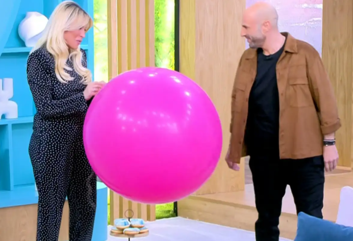 Μπαίνοντας στο πλατό της εκπομπής ο τραγουδιστής προσέφερε στην παρουσιάστρια ένα μεγάλο ροζ μπαλόνι με την παρουσιάστρια να εξομολογείται πως είναι το αγαπημένο της χρώμα.