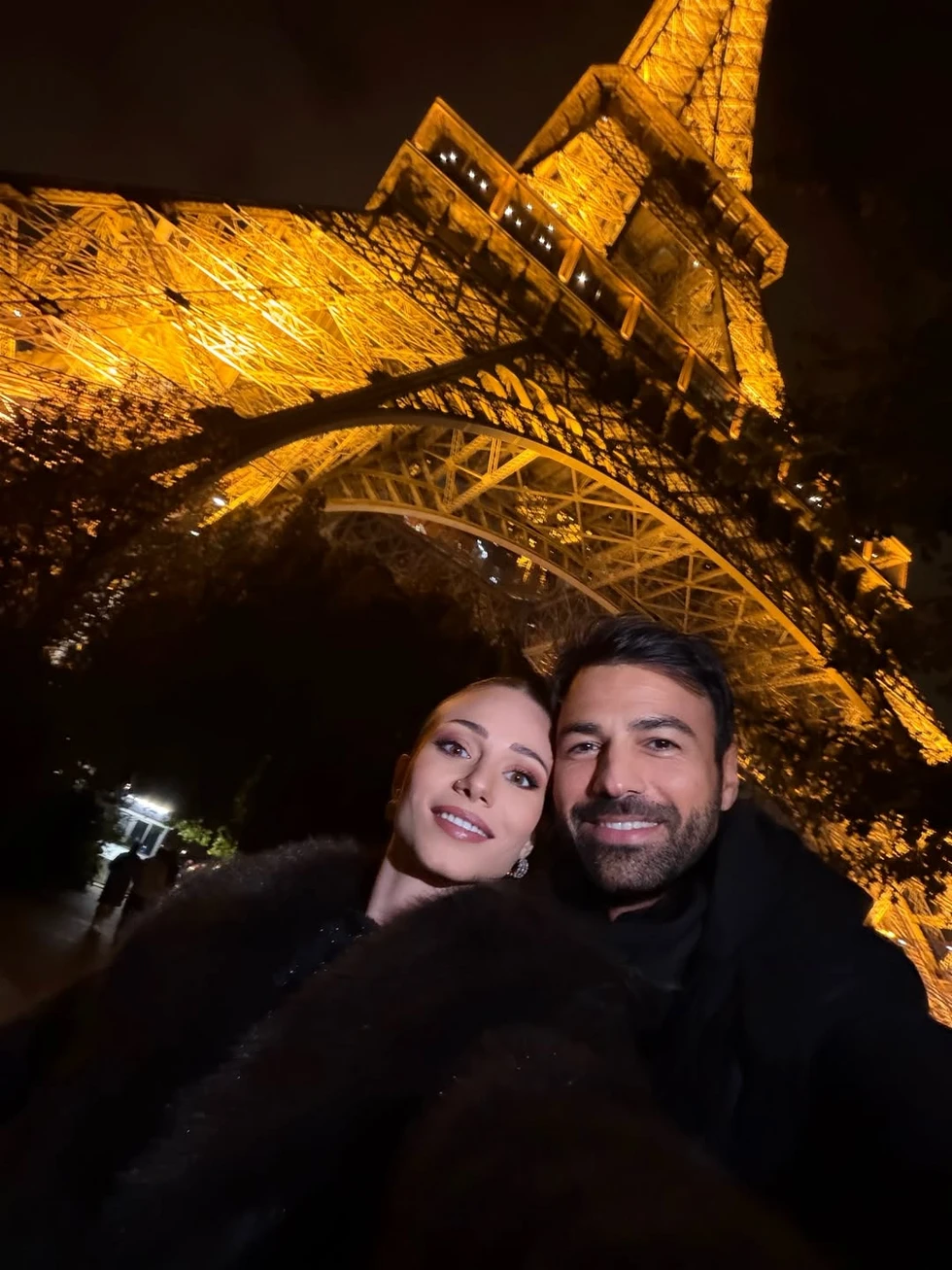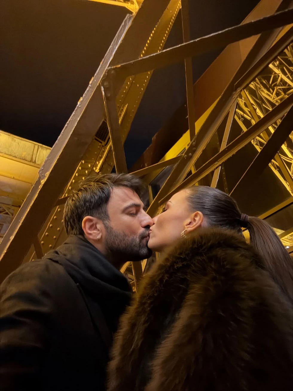 Σε μία από τις φωτογραφίες, το ζευγάρι ποζάρει με φόντο τον εμβληματικό Πύργο του Άιφελ, ενώ σε μια άλλη ανταλλάσσει ένα τρυφερό φιλί κάτω από τον παριζιάνικο ουρανό — μια εικόνα βγαλμένη σαν από ταινία.