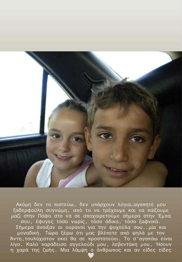 «Ακόμη δεν το πιστεύω, δεν υπάρχουν λόγια… αγαπημένε μου ξαδερφούλη συγγνώμη, από το να τρέχουμε και να παίζουμε μαζί στην Πάφο στο να σε αποχαιρετούμε σήμερα στην Έμπα σου, έφυγες τόσο νωρίς, τόσο άδικα, τόσο ξαφνικά. Σήμερα άνοιξαν οι ουρανοί για την ψυχούλα σου… μία και μοναδική. Τώρα ξέρω ότι μας βλέπετε από ψηλά με τον Άντη, τουλάχιστον εκεί θα σε προστατεύει. Το σ’ αγαπώ είναι λίγο. Καλό παράδεισο αγγελούδι μου, λεβεντάκι μου. Ήσουν η χαρά της ζωής. Μια λάμψη ο άνθρωπος και αν είδες είδες», έγραψε.