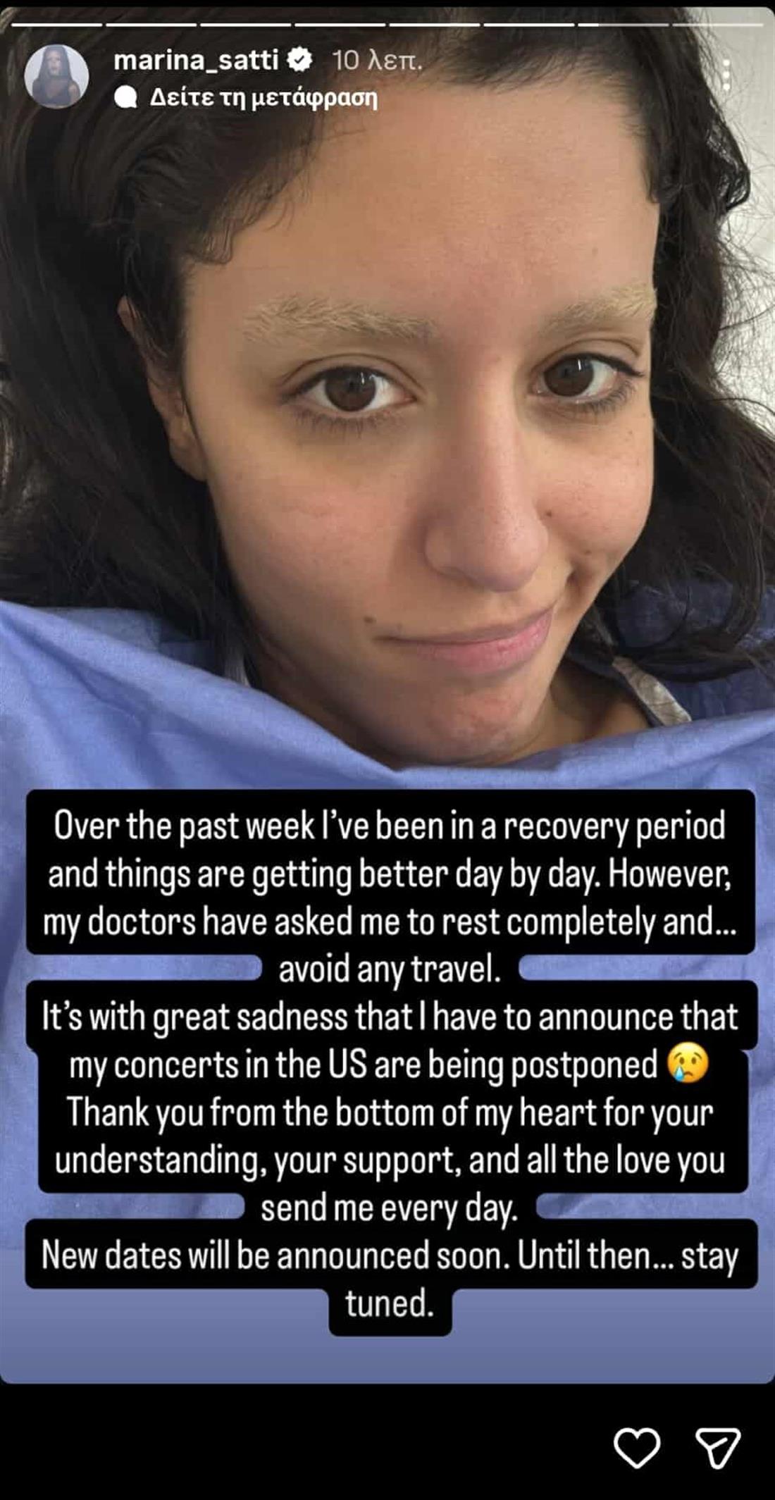 «Την τελευταία εβδομάδα βρίσκομαι σε περίοδο ανάρρωσης και σιγά-σιγά τα πράγματα πηγαίνουν καλύτερα. Οι γιατροί, όμως, μου ζήτησαν απόλυτη ξεκούραση και καμιά μετακίνηση. Με μεγάλη μου λύπη πρέπει να ανακοινώσω ότι οι συναυλίες μου στην Αμερική αναβάλλονται. Σας ευχαριστώ από καρδιάς για την κατανόηση, την στήριξη και όλη την αγάπη που μου στέλνετε καθημερινά. Οι νέες ημερομηνίες θα ανακοινωθούν σύντομα. Μέχρι τότε… stay tuned», έγραψε στην ανάρτησή της η Μαρίνα Σάττι.