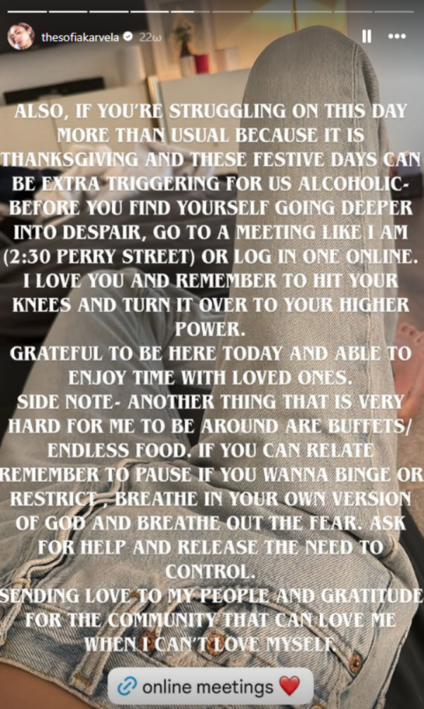 Όπως έγραψε στην ανάρτησή της στο Instagram: «Αν δυσκολεύεσαι αυτήν την ημέρα περισσότερο από το συνηθισμένο επειδή είναι Ημέρα των Ευχαριστιών και αυτές οι γιορτινές μέρες μπορεί να είναι ιδιαίτερα δύσκολες για εμάς τους αλκοολικούς, πριν βρεθείς να βυθίζεσαι ακόμη πιο βαθιά στην απόγνωση, πήγαινε σε μια συνάντηση όπως πηγαίνω κι εγώ ή μπες σε μία διαδικτυακά».