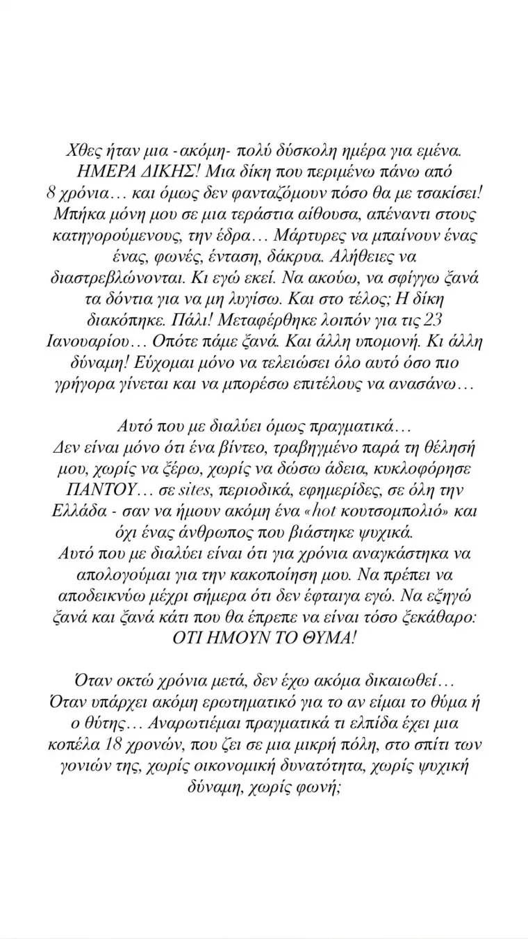 «Χθες ήταν μια -ακόμη- πολύ δύσκολη ημέρα για εμένα. ΗΜΕΡΑ ΔΙΚΗΣ! Μια δίκη που περίμενα πάνω από 8 χρόνια… και όμως δεν φανταζόμουν πόσο θα με τσακίσει! Μπήκα μόνη μου σε μια τεράστια αίθουσα, απέναντι στους κατηγορούμενους, την έδρα… Μάρτυρες να μπαίνουν ένας ένας, φωνές, ένταση, δάκρυα. Αλήθειες να διαστρεβλώνονται. Κι εγώ εκεί. Να ακούω, να σφίγγω ξανά τα δόντια για να μη λυγίσω. Και στο τέλος; Η δίκη διακόπηκε. Πάλι! Μεταφέρθηκε λοιπόν για τις 23 Ιανουαρίου… Οπότε πάμε ξανά. Και άλλη υπομονή. Κι άλλη δύναμη! Εύχομαι μόνο να τελειώσει όλο αυτό όσο πιο γρήγορα γίνεται και να μπορέσω επιτέλους να ανασάνω…»