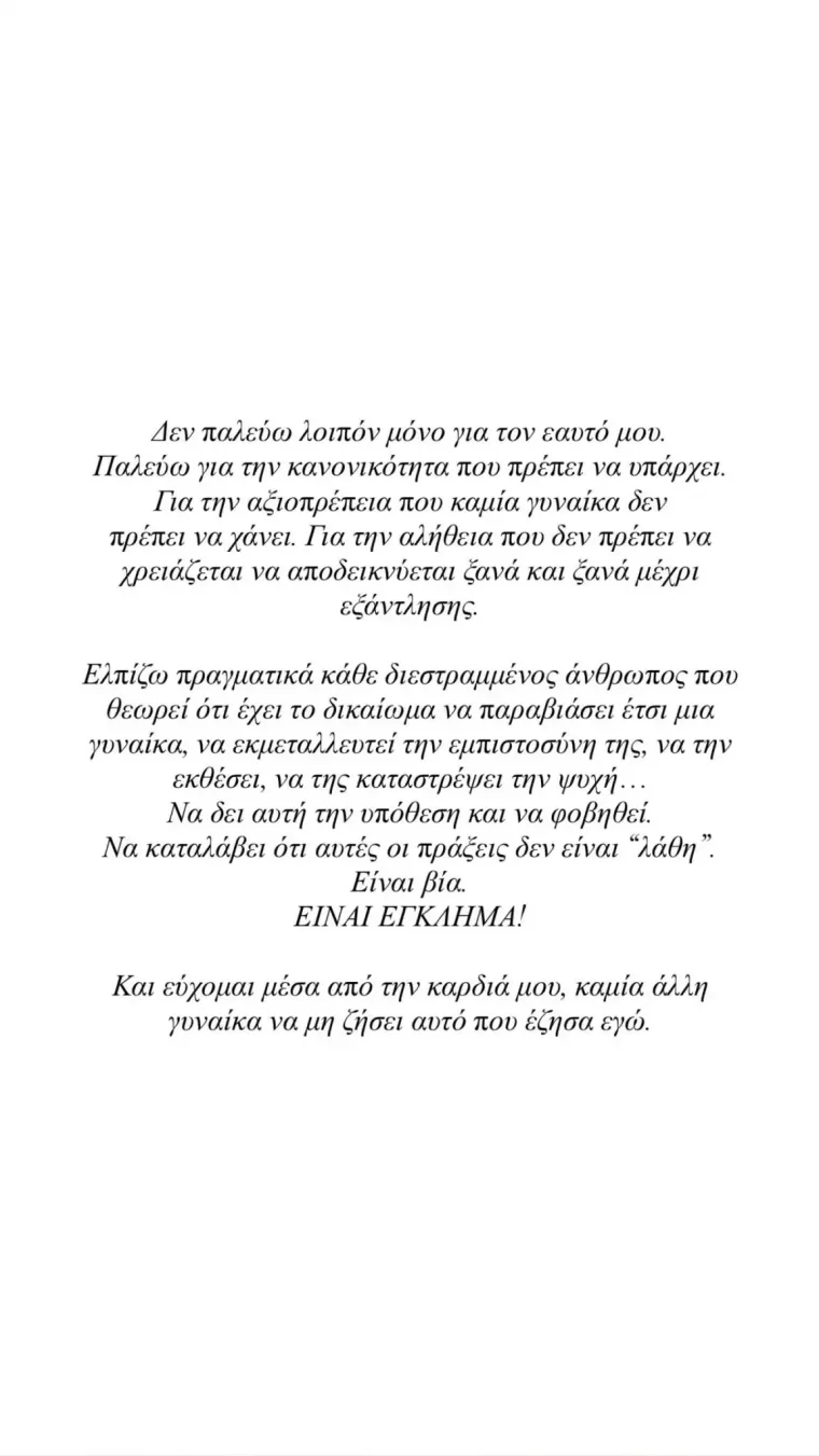 «Δεν παλεύω μόνο για εμένα πια! …Είναι βία. ΕΙΝΑΙ ΕΓΚΛΗΜΑ! Και εύχομαι μέσα από την καρδιά μου, καμία άλλη γυναίκα να μη ζήσει αυτό που έζησα εγώ».