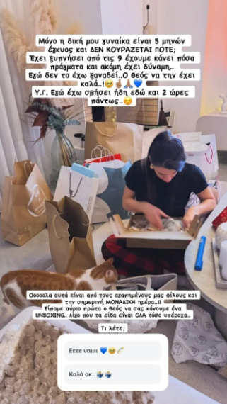 Στην ανάρτησή του έγραψε: «Μόνο η δική μου γυναίκα είναι 5 μηνών έγκυος και ΔΕΝ ΚΟΥΡΑΖΕΤΑΙ ΠΟΤΕ; Έχει ξυπνήσει από τις 9 έχουμε κάνει πόσα πράγματα και ακόμη έχει δύναμη… Εγώ δεν το έχω ξαναδεί... Ο Θεός να την έχει καλά! Υ.Γ. Εγώ έχω σβήσει ήδη εδώ και 2 ώρες πάντως. Όλα αυτά είναι από τους αγαπημένους μας φίλους και την σημερινή μοναδική ημέρα». Δείτε πιο κάτω τη σχετική εικόνα: