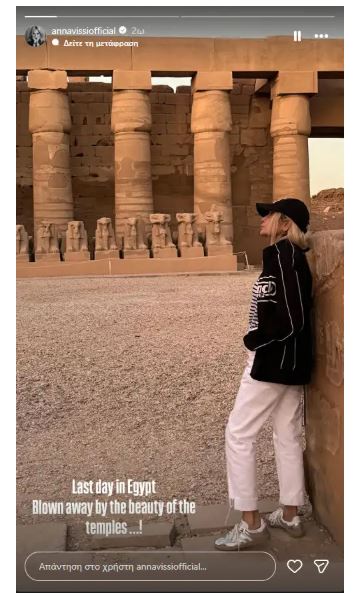 «Τελευταία μέρα στην Αίγυπτο. Εντυπωσιασμένη από την ομορφιά των ναών..», έγραψε στις νέες της αναρτήσεις η Άννα Βίσση, λίγο πριν επιστρέψει στην Ελλάδα.