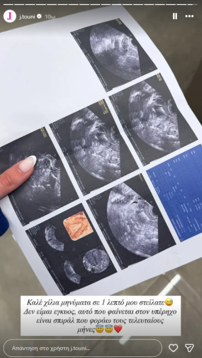 Η Ιωάννα Τούνη έσπευσε να ξεκαθαρίσει την κατάσταση μέσω νέας ανάρτησης, γράφοντας: «Καλέ χίλια μηνύματα σε 1 λεπτό μου στείλατε. Δεν είμαι έγκυος, αυτό που φαίνεται στον υπέρηχο είναι σπιράλ που φοράω τους τελευταίους μήνες».
