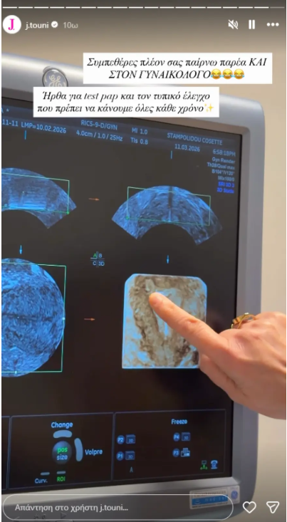 Στο πρώτο story που έκανε σημείωσε: «Συμπεθέρες πλέον σας παίρνω παρέα και στον γυναικολόγο. Ήρθα για test pap και τον τυπικό έλεγχο που πρέπει να κάνουμε όλες κάθε χρόνο».