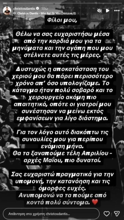 Ο Χρήστος Δάντης διευκρίνισε πως θα μείνει μακριά από τη μουσική σκηνή και τις επαγγελματικές του υποχρεώσεις για σχεδόν ενάμιση μήνα. «Για τον λόγο αυτό διακόπτω τις συναυλίες μου για περίπου ενάμιση μήνα. Θα τα ξαναπούμε τέλη Απριλίου με αρχές Μαΐου, πιο δυνατοί. Σας ευχαριστώ πραγματικά για την υπομονή, την κατανόηση και τις όμορφες ευχές. Ανυπομονώ να τα πούμε από κοντά πολύ σύντομα», πρόσθεσε.
