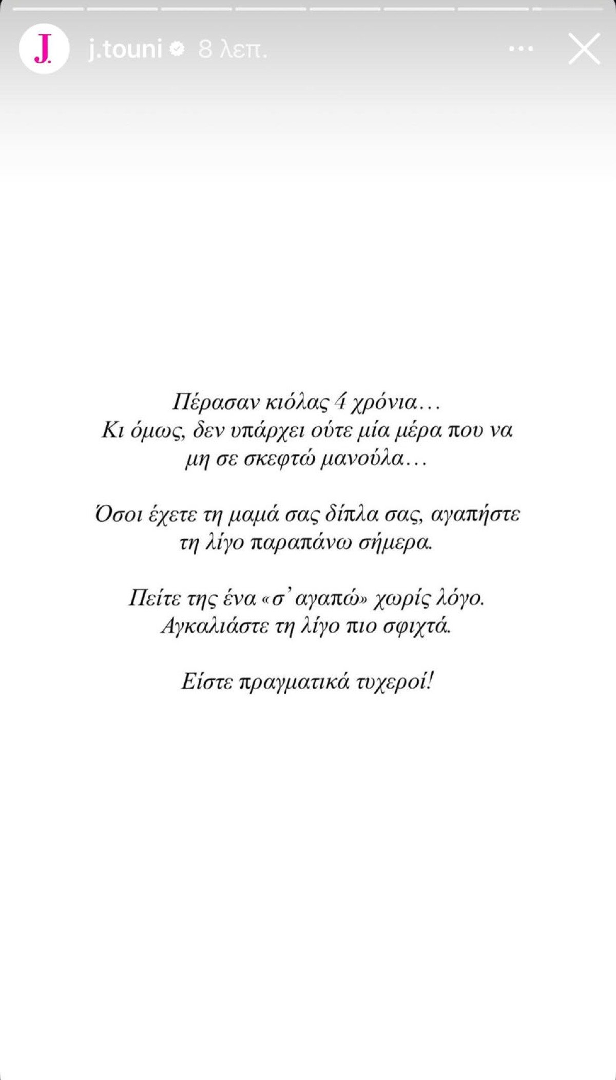 Αφού δημοσίευσε την αγαπημένη της κοινή φωτογραφία από όταν ήταν μικρή, ακολούθησε και το κείμενο: «Πέρασαν κιόλας 4 χρόνια…Κι όμως, δεν υπάρχει ούτε μία μέρα που να μη σε σκεφτώ μανούλα. Όσοι έχετε τη μαμά σας δίπλα σας, αγαπήστε τη λίγο παραπάνω σήμερα. Πείτε της ένα “σ’ αγαπώ” χωρίς λόγο. Αγκαλιάστε τη λίγο πιο σφιχτά. Είστε πραγματικά τυχεροί!».