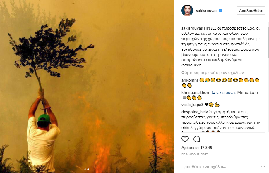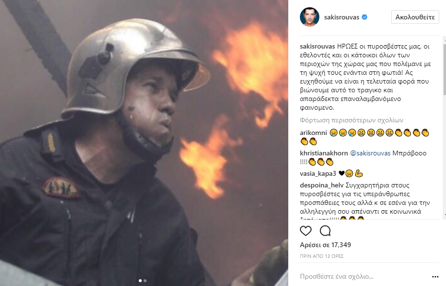 Οι φωτογραφίες από πυροσβέστες ξαπλωμένους στο πάτωμα από τον αποπνικτικό καπνό και η έκκληση για νερό είναι πράγματα που έχουν σημαδέψει όλους τους Έλληνες! Ο Σάκης Ρουβάς μέσα από τον προσωπικό του λογαριασμό στο instagram θέλησε με μια συγκλονιστική φωτογραφία κι ένα ακόμα πιο συγκλονιστικό μήνυμα να πει ένα μπράβο στους ανθρώπους που παλεύουν για να τις σβήσουν και να σώσουν ότι μπορούν.