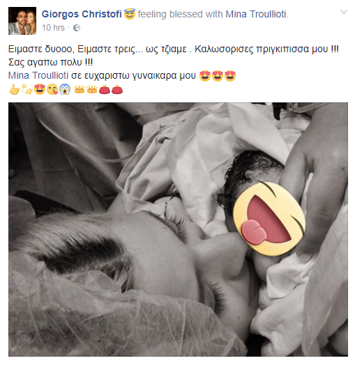 Μέσα από τον προσωπικό του λογαριασμό στο instagram πόσταρε την παραπάνω εικόνα, γράφοντας: “Καλωσόρισες πριγκίπισσά μου”. Ενώ στο προφίλ του στο facebook, ανήρτησε μία φωτογραφία της συντρόφου του αγκαλιά με τη μπέμπα τους, γράφοντας στη λεζάντα που τη συνόδευσε: “Είμαστε δυοοο, Είμαστε τρεις... ως τζιαμε . Καλωσόρισες πριγκίπισσα μου !!! Σας αγαπώ πολύ !!! Μίνα Τρουλλιώτη, σε ευχαριστώ γυναικάρα μου”.