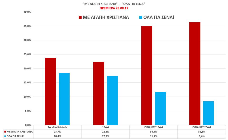 Συγκεκριμένα, η εκπομπή της Κωνσταντίνας Ευριπίδου «Όλα για σένα» έγραψε περίπου 17,3 % ενώ προηγήθηκε η εκπομπή της Χριστιάνας Αριστοτέλους κατά 5,7% κτυπώντας περίπου 23 %.
