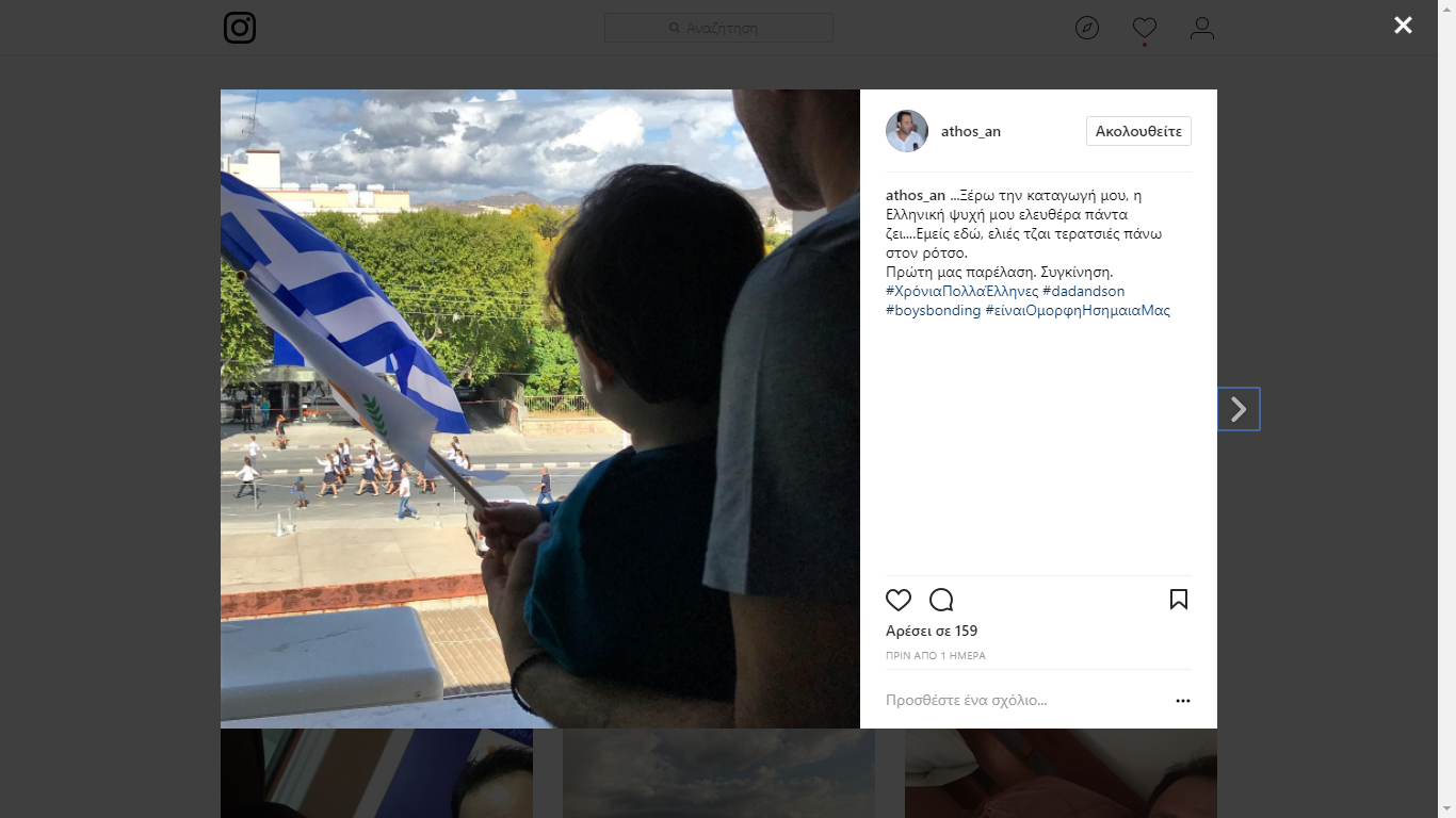 «Πρώτη μας παρέλαση. Συγκίνηση», έγραψε κάτω από τη φωτογραφία που ανάρτησε στον λογαριασμό του στο instagram, για να περιγράψει τα συναισθήματα των στιγμών που παρακολουθούσε για πρώτη φορά την παρέλαση της 28ης Οκτωβρίου αγκαλιά με τον γιο του.