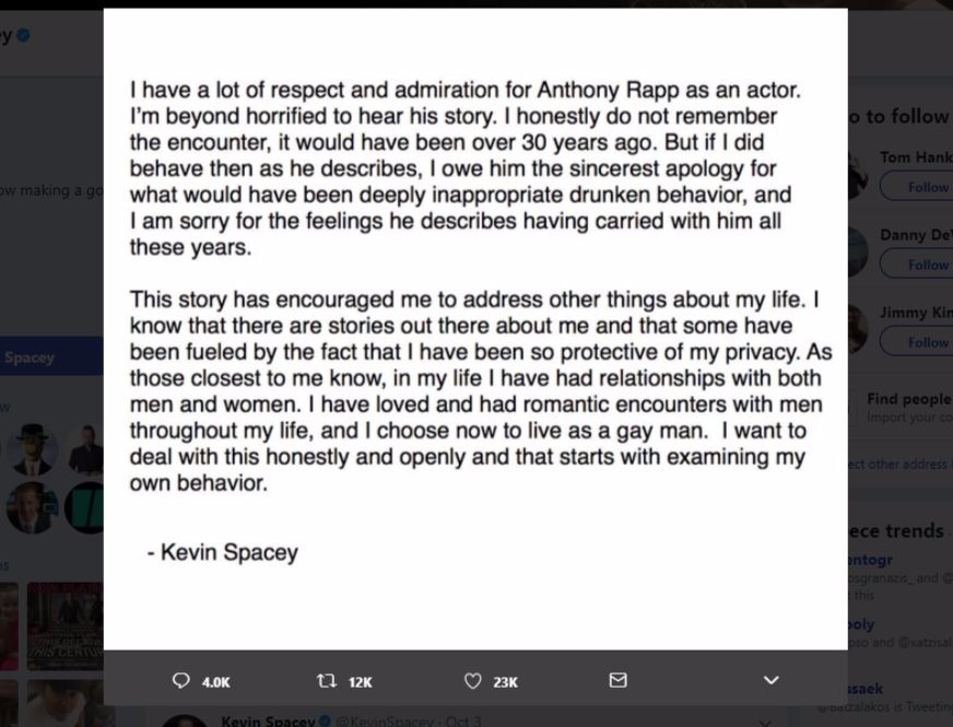 Συγκεκριμένα, ο Kevin Spacey έγραψε: