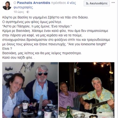 «Κόψ' το ρε Βασίλη το γαμημένο. Σβήσ'το να πάει στο διάολο. Ο αγαπημένος μου φίλος όμως μού' λεγε. ''Άσ' το ρε Πάσχαλε, τι μας έμεινε; Ένα τσιγάρο.'' Κρίμα ρε Βασιλάκη. Χάσαμε έναν καλό φίλο, που άμα δεν σταματούσαμε στην Λάρισα για καφέ, να μας κεράσει και να τα πούμε, στεναχωριότανε. Βρισκόμασταν στο φιλόξενο σπίτι του και τραγουδούσαμε με όλους τους φίλους και ήτανε πανευτυχής. ''Αre you lonesome tonght'' Elvis? Βασιλάκη, μας λείπεις και θα μας λείψεις περισσότερο.