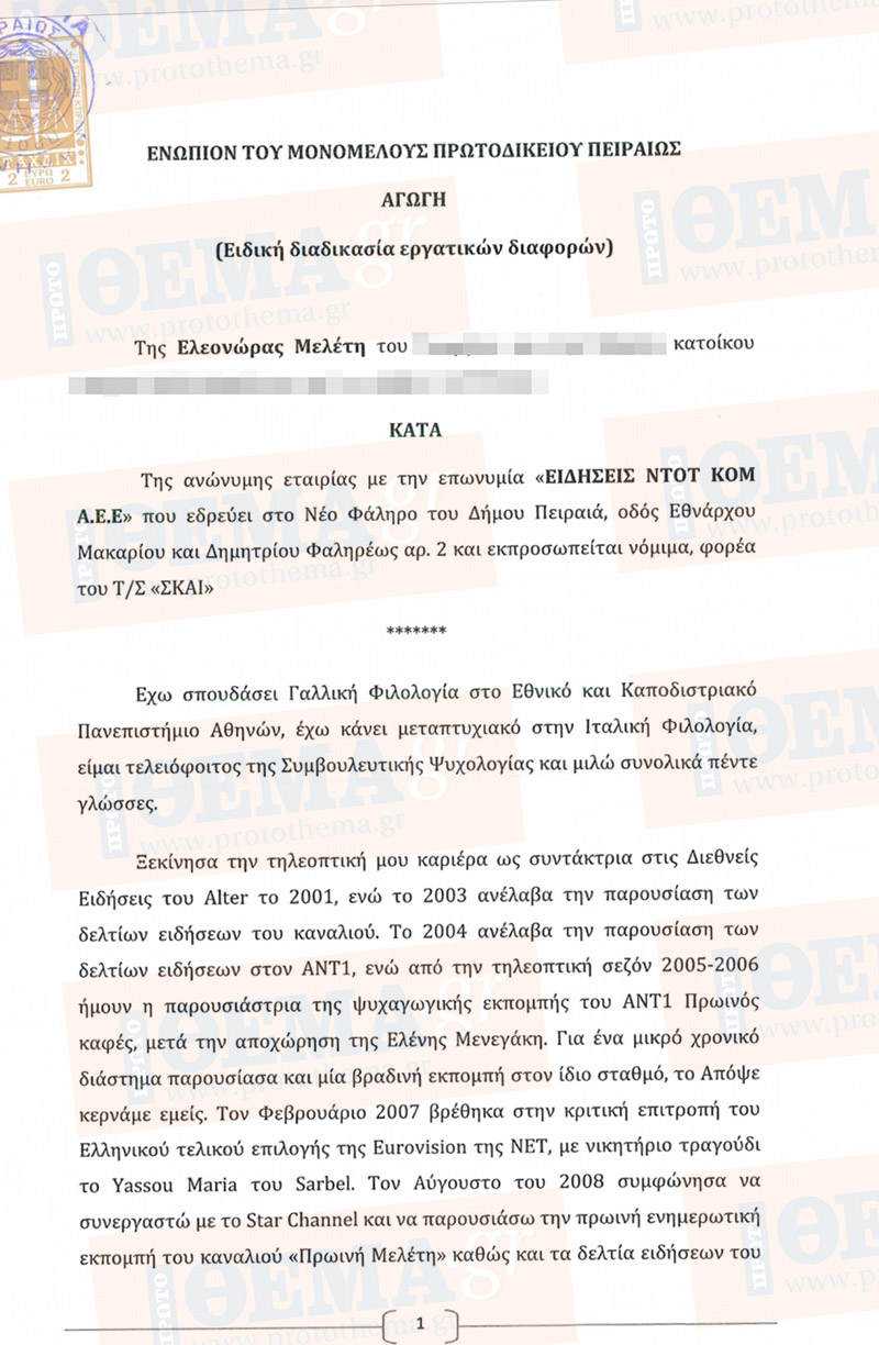 Πριν από λίγες ημέρες έφτασε στον σταθμό του Παλαιού Φαλήρου αγωγή κατατεθειμένη στο Μονομελές Πρωτοδικείο Πειραιά, με την οποία η γνωστή παρουσιάστρια, μέσω του δικηγορικού γραφείου του κ. Νίκου Αγαπηνού, ζητά για μισθούς ποσό της τάξης των 17.065,26 ευρώ, ενώ για χρηματική ικανοποίηση λόγω ηθικής βλάβης 30.000 ευρώ. Μαζί με το δώρο Χριστουγέννων και τα δικαστικά έξοδα, το ποσό αγγίζει ή και ξεπερνά τα 50.000 ευρώ. Διαβάστε παρακάτω… Η Ελεονώρα Μελέτη ισχυρίζεται ότι προσελήφθη προφορικά την 1η Απριλίου και κατόπιν η προφορική συμφωνία έγινε και γραπτή, στις 12 Μαΐου του 2017. Όπως αναφέρει στην αγωγή της, είχε συμφωνήσει την παρουσίαση νέας καθημερινής εκπομπής, ενημερωτικής και ψυχαγωγικής, απορρίπτοντας άλλες προτάσεις, αλλά η συνεργασία με το κανάλι διεκόπη απρόσμενα και άνευ λόγου: «Παρά το γεγονός ότι είχαμε συμφωνήσει με τον σταθμό την περαιτέρω συνεργασία, αντιμετώπισα μια αδιάφορη και επιθετική στάση, σε σημείο να μην μπορώ να επικοινωνήσω με τους εκπροσώπους του καναλιού, οι οποίοι με απέφευγαν επιμελώς και εξακολουθητικώς. Αίφνης την 28η Αυγούστου το κανάλι μου ανακοίνωσε ότι δεν επιθυμεί την περαιτέρω συνεργασία μαζί μου και εντέλει την 31η Αυγούστου μου ανακοίνωσε ότι διακόπτει οριστικά τη μεταξύ μας σύμβαση, ενώ την ίδια ημέρα δήλωσε ψευδώς έναντι των αρμοδίων αρχών την οικειοθελή αποχώρησή μου ενώ ουδέποτε συνέβη αυτό». Η Ελεονώρα Μελέτη, η οποία διανύει μια από τις πιο ευτυχισμένες περιόδους της ζωής της, μια που σε λίγους μήνες θα γίνει μητέρα, κάνει λόγο στα δικόγραφα και για την εγκυμοσύνη της: «Ως προελέχθη κυοφορώ ήδη από την 7.7.2017 και το γεγονός της εγκυμοσύνης μου καθιστά άκυρη την απόλυσή μου, η οποία μετά ταύτα τυγχάνει πολλαπλώς άκυρη. Η γνώση της κατάστασής μου σαφώς και υπήρχε στο κανάλι. Σκοπίμως και εν αγνοία μου προσέδωσε ψευδώς τον χαρακτηρισμό της οικειοθελούς αποχώρησης, δεν εγένετο καν επίκληση σπουδαίου λόγου όπως απαιτεί ο νόμος». Οι διεκδικήσεις της Ελεονώρας Μελέτη θα εκδικαστούν στις 5 Δεκεμβρίου του 2017 στο Πρωτοδικείο του Πειραιά και απ’ ό,τι φαίνεται, θα αποτελέσουν θέμα συζήτησης σε ηλεκτρονικό και έντυπο Τύπο, αλλά και σε τηλεοπτικές εκπομπές. Αξίζει να σημειωθεί ότι η συγκεκριμένη αγωγή αφορά κέρδη εξαρτημένης εργασίας και θα ακολουθήσει και δεύτερη, που θα αφορά τα διαφυγόντα κέρδη, βάσει ιδιωτικού συμφωνητικού.