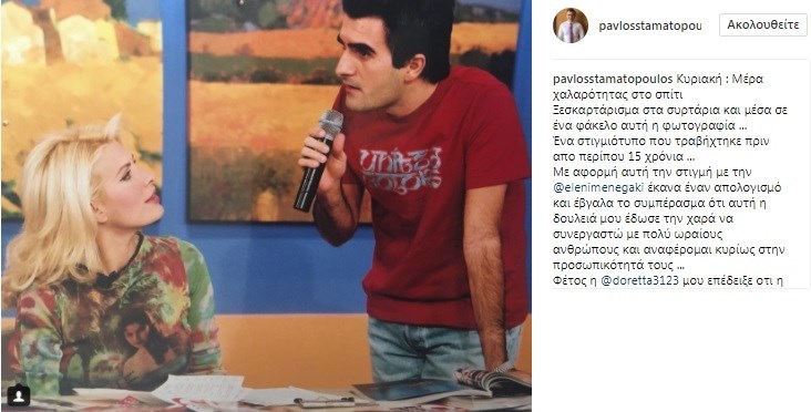 O Παύλος Σταματόπουλος το πρωί της Κυριακής 05/11 θυμήθηκε στιγμές από το παρελθόν, χαλαρώνοντας στο σπίτι του. Ο αρχισυντάκτης της εκπομπής «Εδώ» στον ΣΚΑΪ παλιότερα είχε συνεργαστεί με την Ελένη Μενεγάκη και δημοσίευσε στον προσωπικό του λογαριασμό στο Instagram μια αδημοσίευτη φωτογραφία τους.