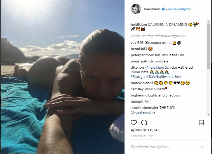 Το γερμανικής καταγωγής μοντέλο αποφάσισε να κάνει ένα δώρο στους διαδικτυακούς ακόλουθούς της αναρτώντας στο Instagram μια φωτογραφία της με γυμνά οπίσθια, ενώ έκανε ηλιοθεραπεία σε κάποια παραλία. Η λεζάντα έγραφε: «California dreaming».