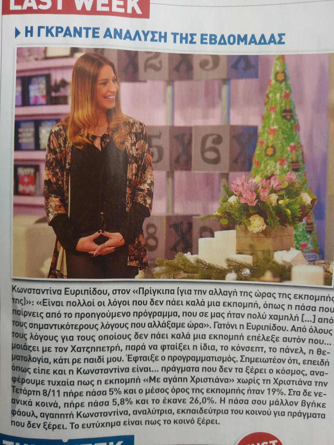 "Είναι πολλοί οι λόγοι που δεν πάει καλά μια εκπομπή, όπως η πάσα που παίρνεις από το προηγούμενο πρόγραμμα, που σε μας ήταν πολύ χαμηλή [...] από τους σημαντικότερους λόγους που αλλάξαμε ώρα". Στο περιοδικό Capuccino που κυκλοφορεί αναλύουν αυτή τη δήλωση της Ευρυπίδου, χαρακτηρίζοντάς την Γατόνι. "Από όλους τους λόγους για τους οποίους δεν πάει καλά η εκπομπή επέλεξε αυτόν που... μοιάζει με τον Χατζηπετρή, παρά να φταίξει η ίδια, το κόνσεπτ, το πάνελ, η θεματολογία, κάτι ρε παιδί μου. Έφταιξε ο προγραμματισμός." Στη συνέχεια δε τονίζουν ότι και η εκπομπή της Χριστιάνας Αριστοτέλους, χωρίς την Χριστιάνα την Τετάρτη 8/11 πήρε πάσα 5% και ο μέσος όρος της εκπομπής ήταν 19%. Όπως και στα νεανικά κοινά πήρε πάσα 5,8% και το έκανε 26%.