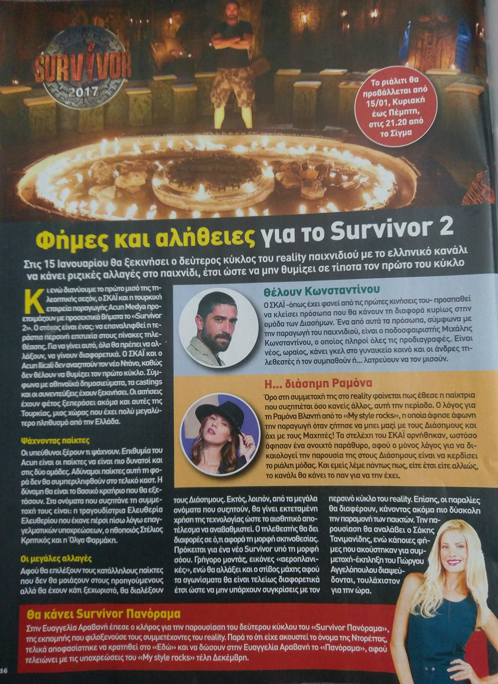 Στις 15 Ιανουαρίου θα ξεκινήσει ο δεύτερος κύκλος του Survivor με το ελληνικό κανάλι να κάνει ριζικές αλλαγές στο παιχνίδι, έτσι ώστε να μην θυμίζει τίποτα τον πρώτο κύκλο. Στόχος τους είναι να επαναληφθεί η τεράστια περσινή επιτυχία και για το λόγο αυτό όλα πρέπει να αλλάξουν, να γίνουν διαφορετικά. Σύμφωνα με το περιοδικό Capuccino, δεν αναζητούν τον καινούριο Ντάνο, καθώς δε θέλουν να θυμίζουν τον πρώτο κύκλο. Τα castings και οι συνεντεύξεις έχουν ήδη ξεκινήσει και άξιοσημείωτη είναι η επιθυμία πολλών να συμμετέχουν στο παιχνίδι, αφού οι αιτήσεις έχουν ξεπεράσει και αυτές της Τουρκίας (μιας χώρας μεγαλύτερης σε πληθυσμό από την Ελλάδα). Οι μεγάλες αλλαγές Αφού γίνει η επιλογή των παικτών, θα γίνει και εκτεταμένη χρήση της τεχνολογίας. Τι σημαίνει αυτό; Το αισθητικό αποτέλεσμα θα αναβαθμιστεί και οι τηλεθεατές θα έχουν την ευκαιρία να δουν διαφορές σε σχέση με την σκηνοθεσία. Επίσης θα δούμε αλλαγές στα αγωνίσματα, που θα είναι τελείως διαφορετικά για να μην υπάρχει σύγκριση με τον περσινό κύκλο. Οι παραλίες θα είναι διαφορετικές και θα είναι ακόμα πιο δύσκολη η επιβίωση. Οι παίκτες πρέπει να είναι δυνατοί και στις δυο ομάδες, και δεν θα υπάρξουν φέτος καθόλου αδύναμοι παίκτες, αφού αυτή είναι η επιθυμία του Acun. Στο τραπέζι έχουν... πέσει τα ονόματα των Ελευθερία Ελευθερίου, Στέλιος Κρητικός και Όλγα Φαρμάκη. Στον ΣΚΑΪ θέλουν τον ποδοσφαιριστή Μιχάλη Κωνσταντίνου στην ομάδα των Διασήμων, ο οποίος πληροί όλες τις προδιαγραφές. Νέος, ωραίος, κάνει γκελ στο γυναικείο κοινό και οι άντρες τηλεθεατές ή τον συμπαθούν ή... λατρεύουν να τον μισούν. Η... διάσημη Ραμόνα θέλει να βρίσκεται συνεχώς στη μικρή οθόνη και στα ριάλτι παιχνίδια. Η Ραμόνα άφησε άφωνη την παραγωγή όταν δήλωσε ότι θέλει να συμμετέχει στο παιχνίδι αλλά και στην ομάδα των... Διασήμων. Ο μόνος λόγος που μπορεί να δικαιολογέι την παρουσία της στους Διάσημους είναι να κερδίσει το ριάλιτι μόδας. Το περιοδικό Capuccino αναφέρει ότι είτε έτσι είτε αλλιώς, το κανάλι θα κάνει το παν για να την έχει. Για να δούμε.
