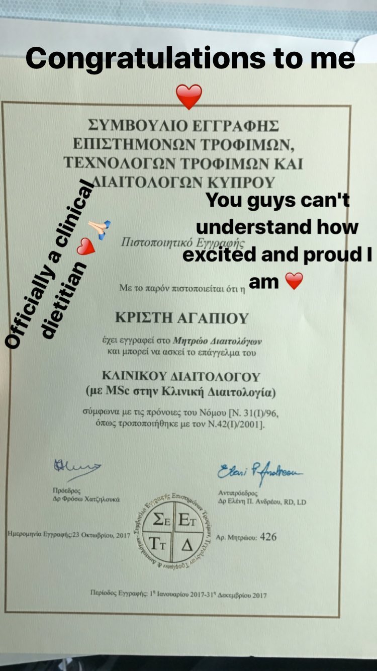 Η Κρίστη Αγαπίου είναι και αυτή λάτρης των social media και πιο συγκεκριμένα λατρεύει το Instagram. Μοιράζεται πολλές στιγμές της καθημερινότητας της μέσω Instastory. Αυτή τη φορά μοιράστηκε μαζί μας κάτι πολύ σημαντικό γι' αυτήν. Η Κρίστη Αγαπίου, πλέον, δεν είναι μόνο μοντέλο και blogger, αλλά και εγγεκριμένη διατροφολόγος. Έχει πάρει το πιστοποιητικό εγγραφής, με το οποίο μπορεί ν' ασκεί το επάγγελμα του Κλινικού Διατροφολόγου. Εμείς να της ευχηθούμε καλή αρχή στο καινούριο της ξεκίνημα.