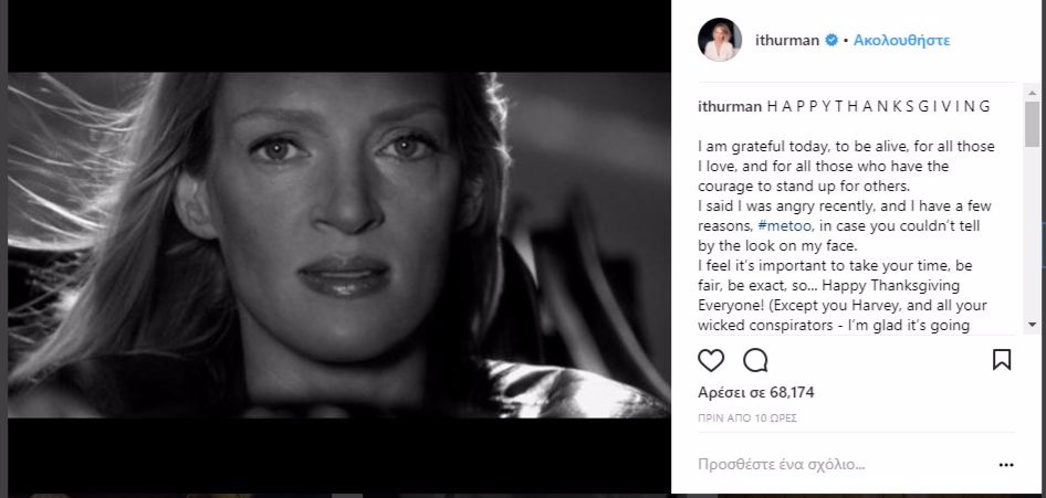 Είμαι χαρούμενη που όλο αυτό πηγαίνει σιγά-σιγά. Δεν σου αξίζει μια σφαίρα» έγραψε σε μια οργισμένη ανάρτηση στο Instagram η Thurman, που συνόδευε μια φωτογραφία της από την ταινία του Weinstein "Kill Bill", στην οποία κράτησε τον ρόλο μιας δολοφόνου που εκδικείται τον αρχιμαφιόζο εραστή της.