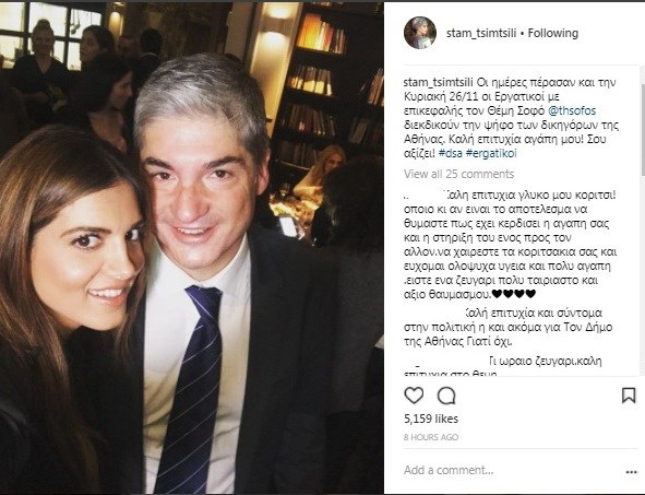 Αυτό απαιτεί σκληρή δουλειά και υπευθυνότητα, χαρακτηριστικά που διαθέτει ο δικηγόρος. Η Σταματίνα, συνεχώς στο πλευρό του αγαπημένου της συζύγου, τον πιστεύει και τον στηρίζει σε κάθε του βήμα. Το βράδυ της Πέμπτης 23 Νοεμβρίου, η παρουσιάστρια του Happy Day θέλοντας να ενημερώσει τους διαδικτυακούς της φίλους για τον Θέμη Σοφό, ανήρτησε μία κοινή τους φωτογραφία στο Instagram. «Οι ημέρες πέρασαν και την Κυριακή 26/11 οι Εργατικοί με επικεφαλής τον Θέμη Σοφό διεκδικούν την ψήφο των δικηγόρων της Αθήνας. Καλή επιτυχία αγάπη μου! Σου αξίζει!», έγραψε η Σταματίνα Τσιμτσιλή.