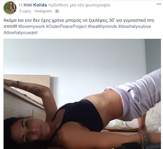 Η αγαπημένη παίκτρια από το ριάλιτι show, μας συμβουλεύει για γυμναστική στο σπίτι, ειδικά όταν δεν προλαβαίνουμε.Δείτε τη φωτογραφία: