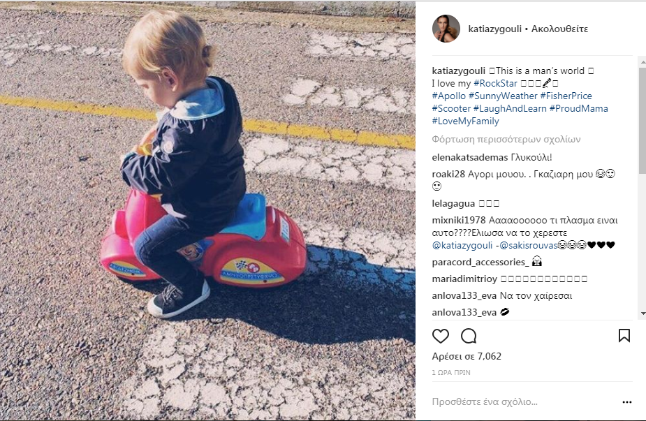 Μπορεί η καθημερινότητά τους να είναι μακριά από τα φώτα της δημοσιότητας, αλλά τα τελευταία χρόνια μοιράζονται στιγμιότυπα και αποσπάσματα από την προσωπική τους ζωή με τα παιδιά τους μέσα από τα social media. Η Κάτια Ζυγούλη το πρωί της Πέμπτης 30 Νοεμβρίου, ανέβασε μια φωτογραφία με τον μικρό Απόλλωνα να προσπαθεί να οδηγήσει το scooter του.