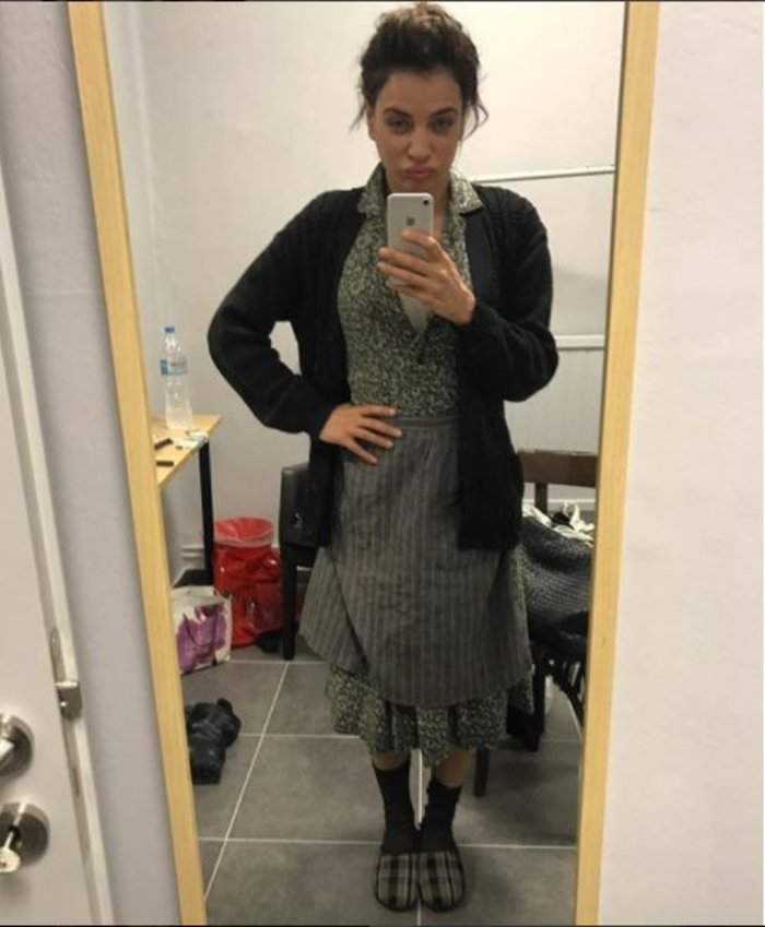 Η μεταμόρφωσή της βέβαια οφείλεται στον ρόλο της στην θεατρική παράσταση «Μια ξεχωριστή μέρα» με τον Σταύρο Ζαλμά και η φωτογραφία είναι τραβηγμένη στα καμαρίνια του θεάτρου.
