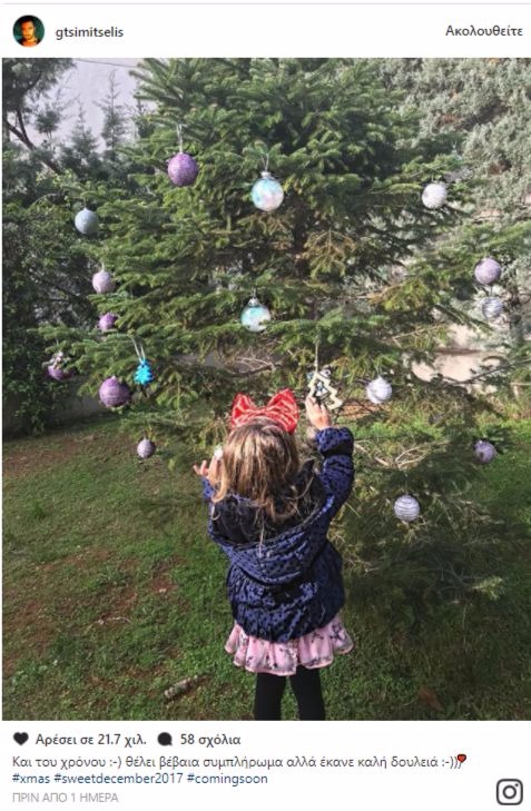 Ο Τσιμιτσέλης φωτογράφησε την Ευαγγελία κατά τη διάρκεια του στολισμού και δημοσίευσε την εικόνα στον προσωπικό λογαριασμό στου το Instagram. “Και του χρόνου" έγραψε στη λεζάντα και συμπλήρωσε με χιούμορ: "Θέλει βέβαια συμπλήρωμα, αλλά έκανε καλή δουλειά"!