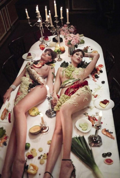 Για το εορταστικό τεύχος της ιταλικής Vogue, τα εντυπωσιακά μοντέλα δεν πόζαραν με τουαλέτες όπως γίνεται συνήθως αυτή την περίοδο, αλλά φωτογραφήθηκαν ξαπλωμένες ολόγυμνες σε τραπέζι με αστακούς, ψάρια, μακαρόνια και τσαμπιά από σταφύλια να καλύπτουν τα επίμαχα σημεία των καλλίγραμμων κορμιών τους.